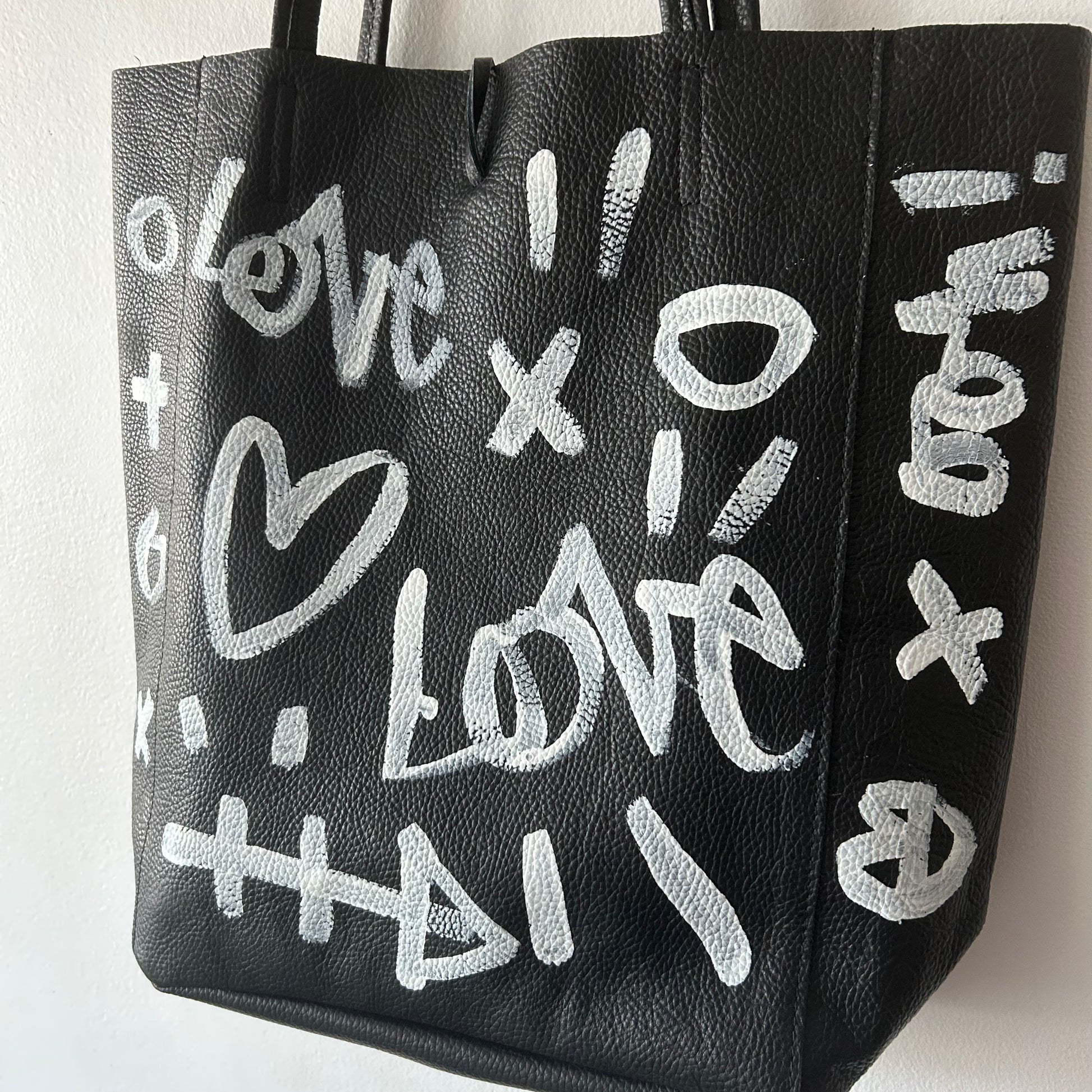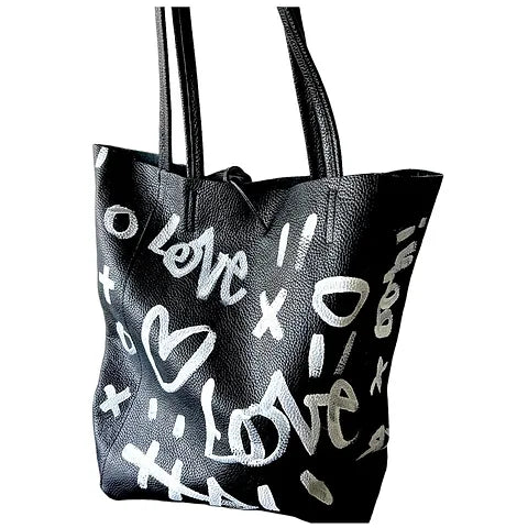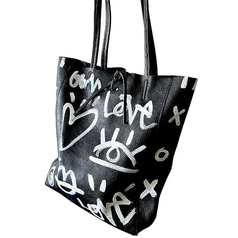 Street art graffiti Italian Leather Tote handbag, beautifully hand-painted and one of a kind. A statement piece that will turn heads. It features an adorable full leather exterior adorned with vibrant graffiti-inspired designs that add a bold and edgy touch to any outfit. The spacious interior allows you to carry all your essentials with ease.