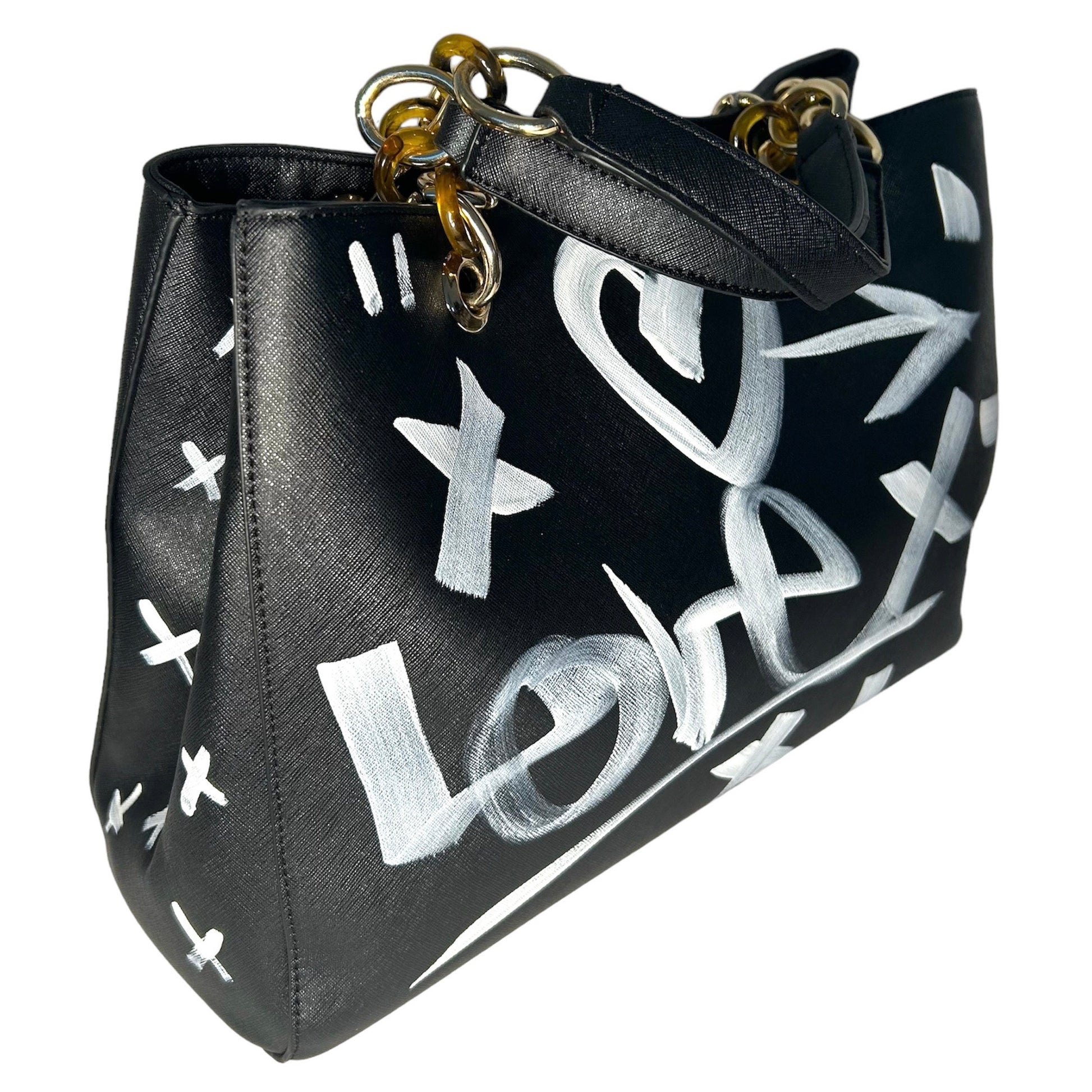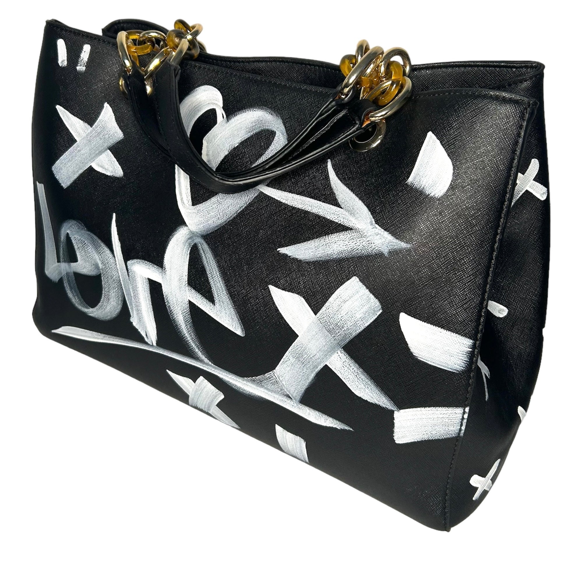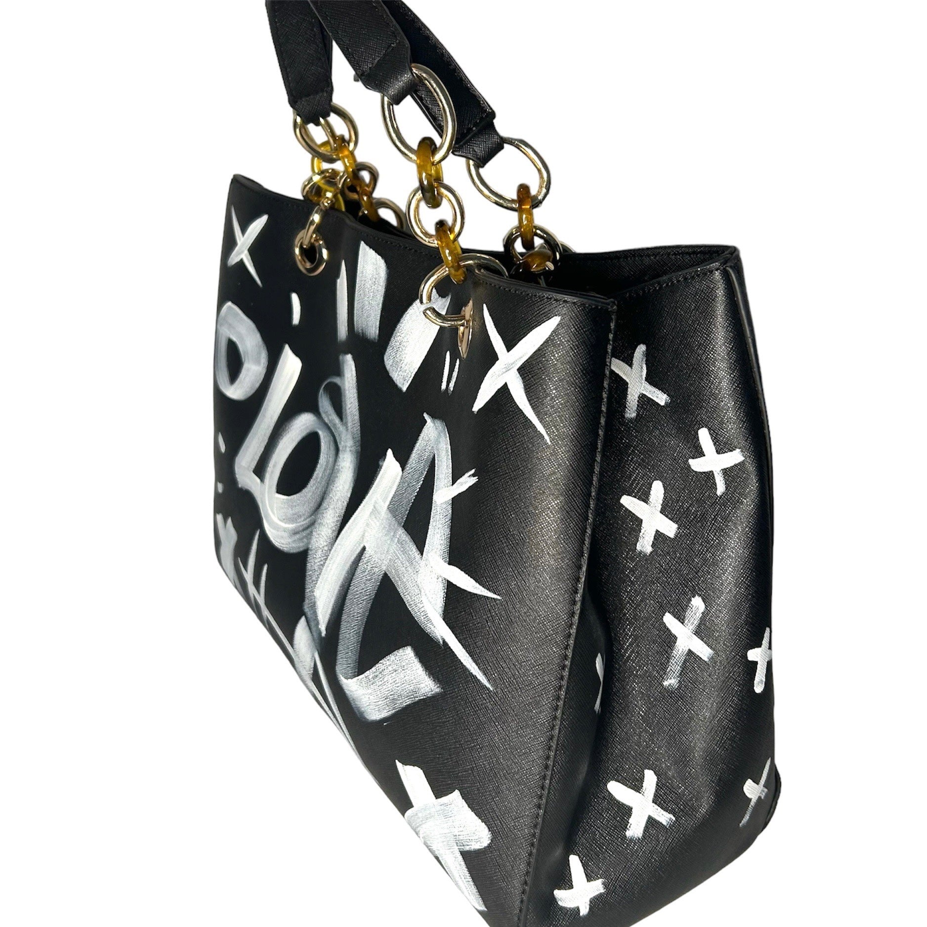 Graffiti Art Handbag in Saffiano Faux Leather. Fine quality vegan leather in black with stark contrasting white hand-painted design